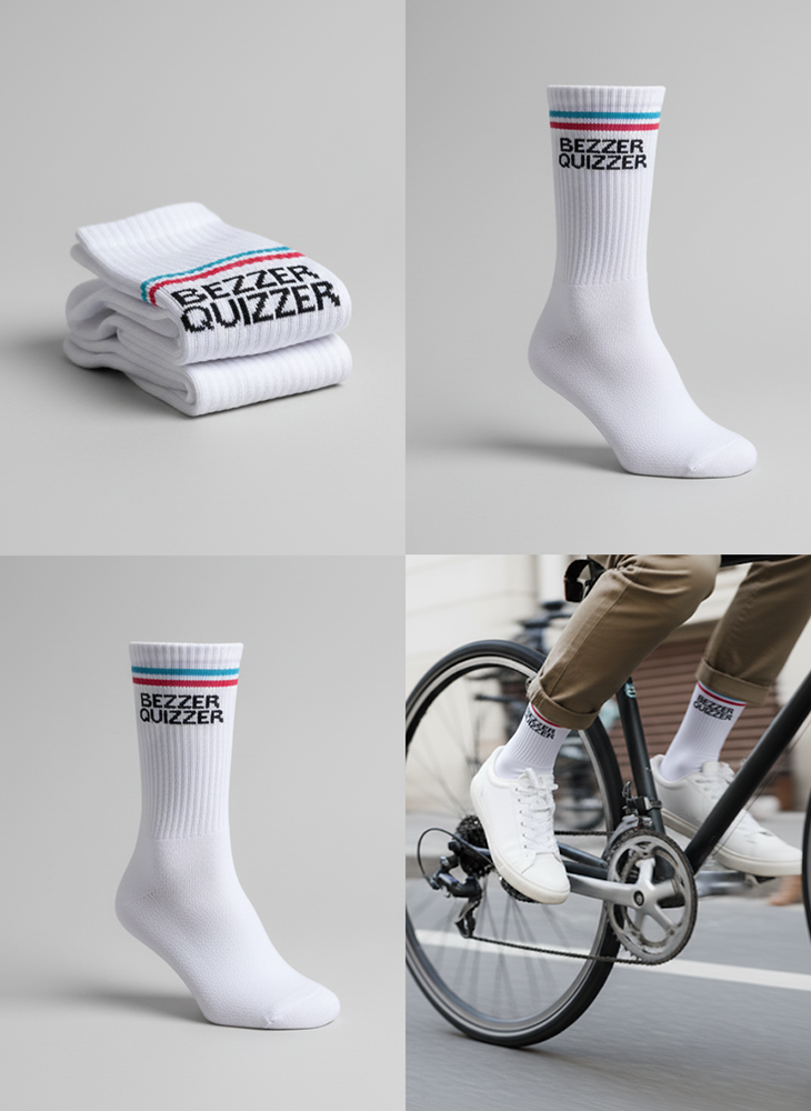 Die weißen Bezzer Quizzer Socken sind Dein perfekter Begleiter für Sommer, Freizeit und natürlich jeden Quiz-Abend. Sie bringen frischen Style und quiztastische Energie an Deine Füße – egal ob im Alltag oder beim nächsten Pubquiz.